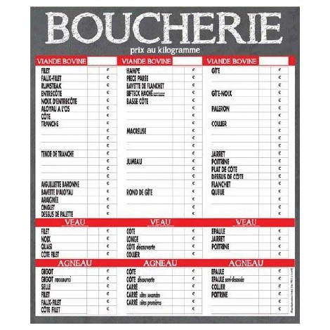 | Réf. TC :113393368 | Panneau tarifs boucherie | VBVAP : Viande Bovine, Veau, Agneau, Porc | 70 x 100 | A l'unité | -