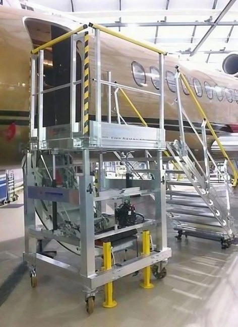 Il peut être ajusté en hauteur grâce à une plateforme réglable de 1400 à 1800 mm, facilitant ainsi l'accès à divers types d'aéronefs comme les Airbus ou les jets Falcon 900 et 2000.