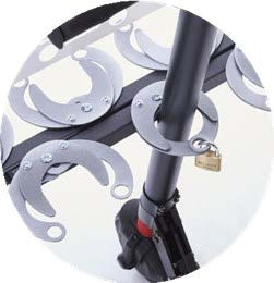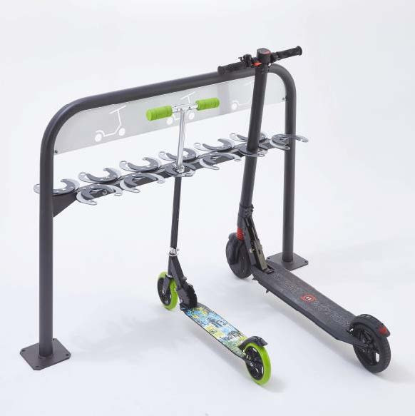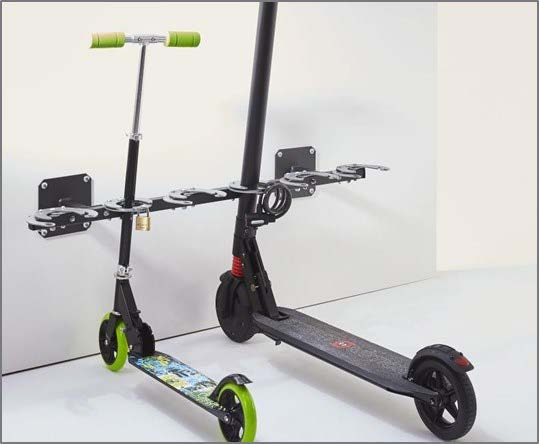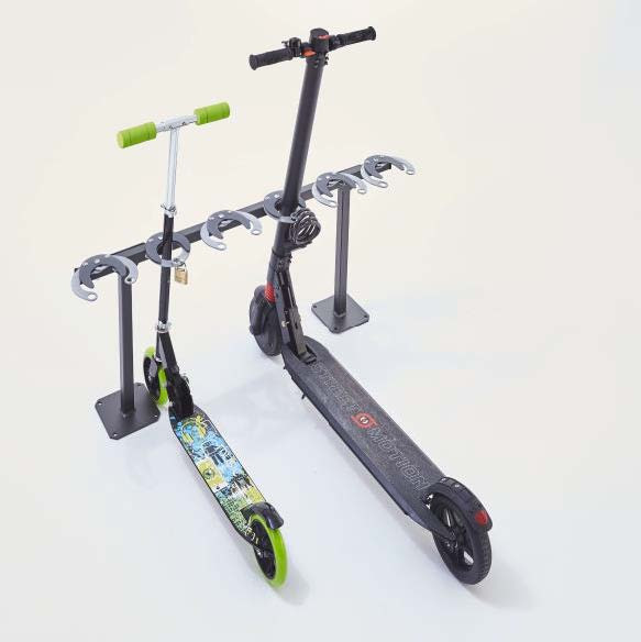 Le support à trottinettes côte à côte mural, permet de ranger jusqu’à 6 trottinettes. Il dispose d’un système anti-vol permettant de bloquer le mât de la trottinette avec un cadenas ou un câble.