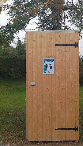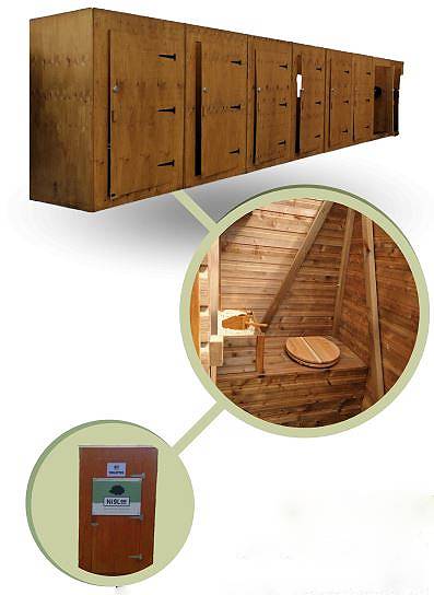 Chaque cabine en bois robuste est équipée d'un abattant de WC, d'une cuve de réception et d'un éclairage autonome.