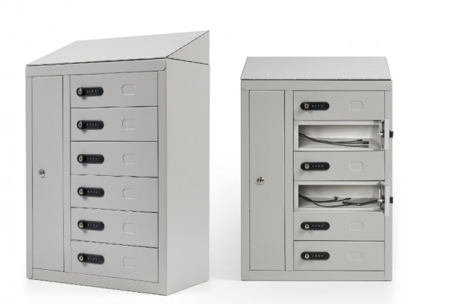 Colonne de rangement pour téléphones portables comprenant 6 casiers individuels avec coiffe anti-poussière. Cette solution vous permettra de mettre à l'abri vos smartphones dans un espace protégé et toujours à proximité des utilisateurs. De fabrication robuste et non dépourvue d'une bonne esthétique, nous vous propons ces colonnes en coloris gris ou en d'autres coloris avec plus-value.