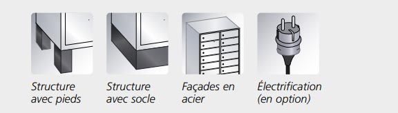 - Branchement électrique optionnel dans chaque casier (les prises sont toujours montées à gauche, câble de raccordement armoire incl.)