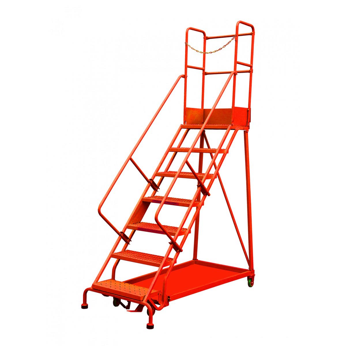 Ses échelons antidérapants sont renforcés par 2 rampes latérales de sécurité, un garde-corps, une main courante ainsi qu’une sous lisse à mi-hauteur.