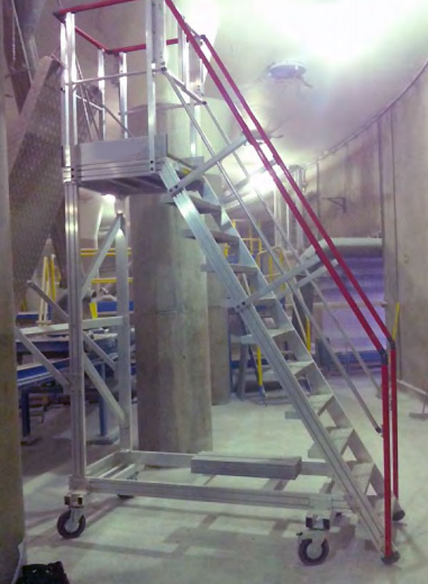 Pouvant être déplacé aisément, cet escalier peut atteindre une hauteur de 2.6 mètres, et offre des conditions de travail favorables aux opérateurs.