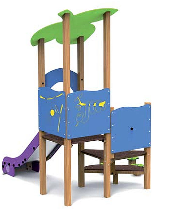 Elle est composée d’une tour avec une feuille pour toiture, de marches, de marches sous forme d’arbrisseaux, d’un jeu tourbillon, d’un dessin serpent et d’un toboggan.