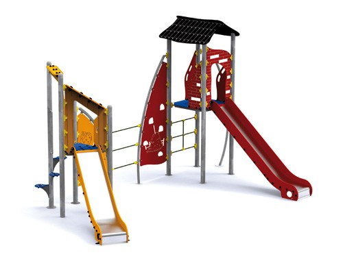 Elle est composée de 2 tours, de 2 toboggans, d’escaliers et de 2 jeux d’escalade.
