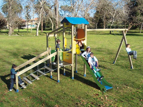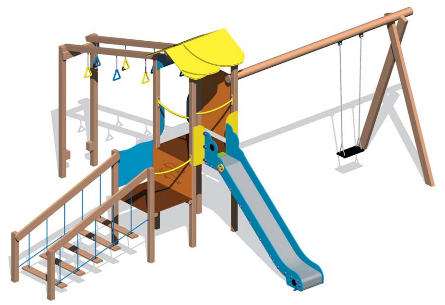 La structure est composée d’une tour à 2 étages avec toit à 2 pans, d’une échelle oscillante, d’un jeu labyrinthe, d’anneaux, d’une balançoire à siège plat et d’une glissière, un méli-mélo de différents jeux pour de longues heures d’amusement.