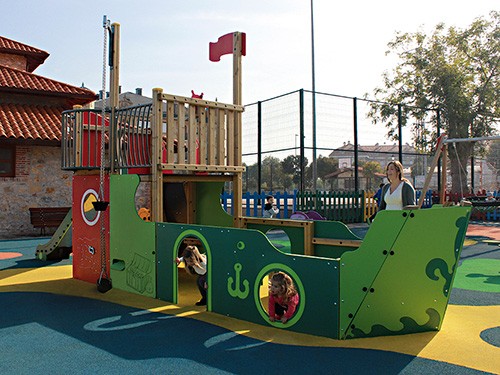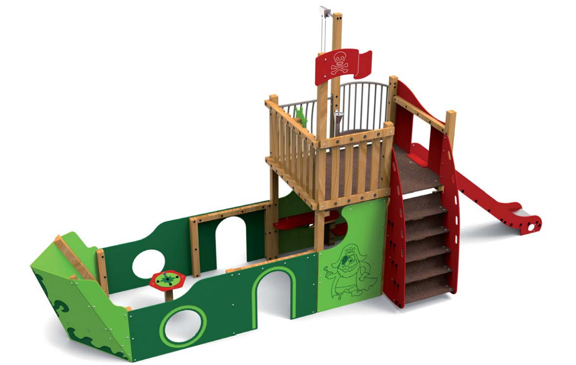 La structure est composée d’une tour avec poste de vigie, d’une barre de navire, d’un escalier, d’une table à trémie, d’un siège, d’un monte-sable avec tube, d’un jeu boussole et d’une glissière, un univers parfait pour plonger dans le monte des pirates.
