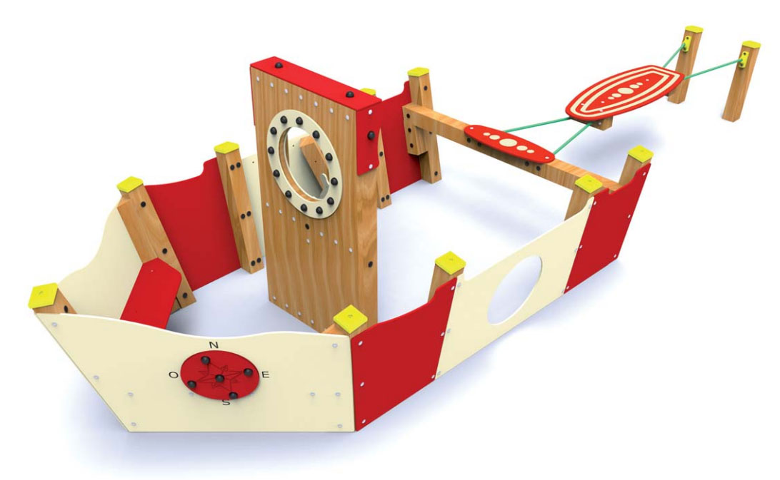 La structure est composée d’un bateau avec planche de surf à équilibre, d’un petit escalier à cordes, d’un