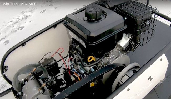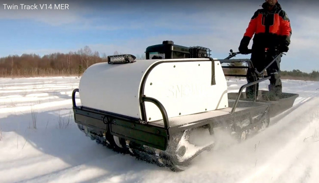 Nouveau Snowdog Twin Track V14MER 2021: le Snowdog le plus puissant et le plus grand pour les charges lourdes et les tâches professionnelles, équipé de deux chenilles de 380 mm, d’une transmission avec vitesse lente et marche arrière, et du dernier moteur de la série professionnelle Vanguard 400 avec un couple plus élevé. Il peut travailler sur des pentes allant jusqu’à 35° et transporter de grands traîneaux.
