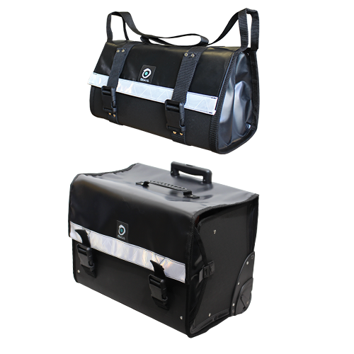 - La canne peut recevoir une 2ème sacoche qui se maintient par une sangle avec fermoir et repose sur la sacoche principale.