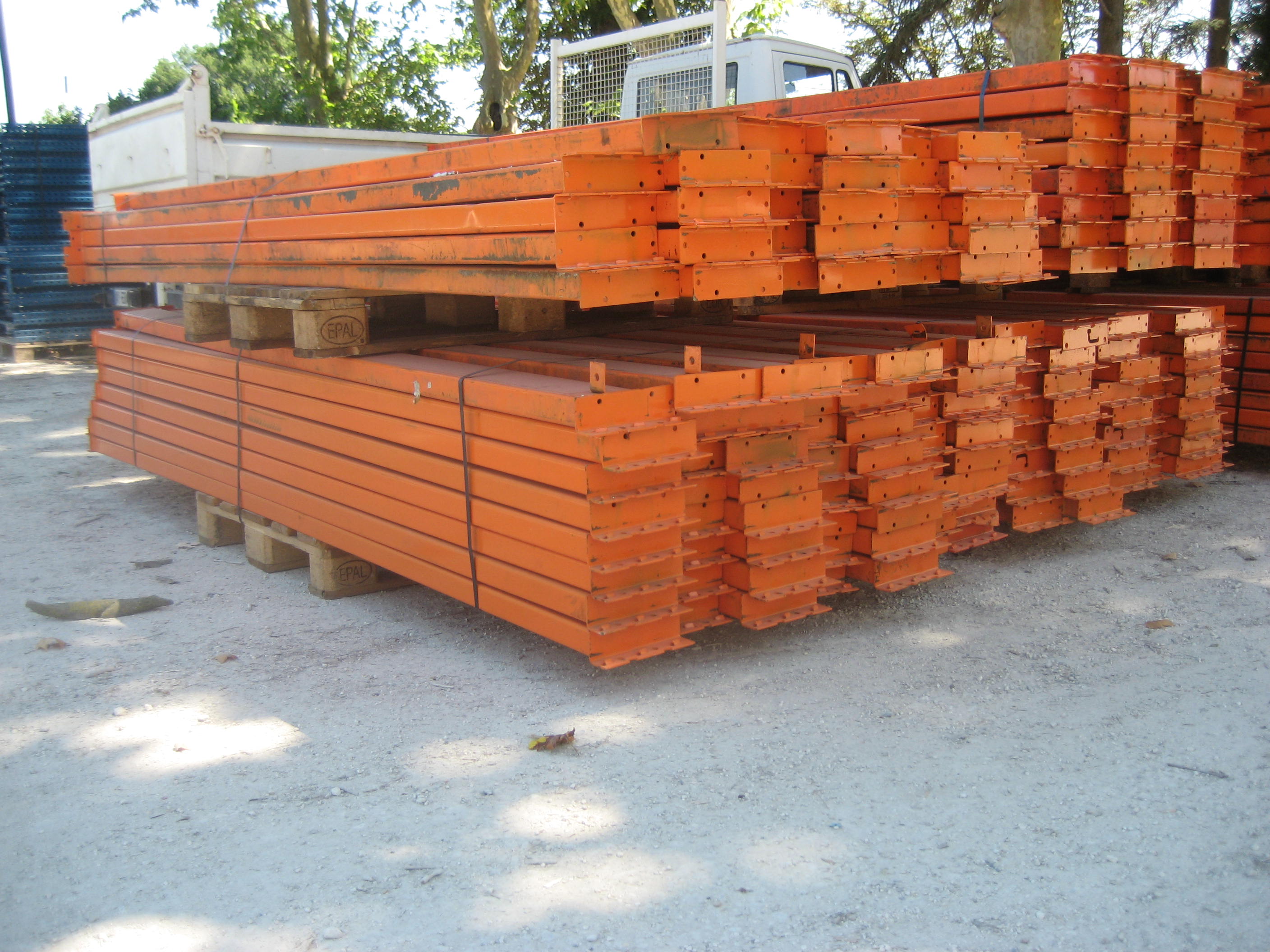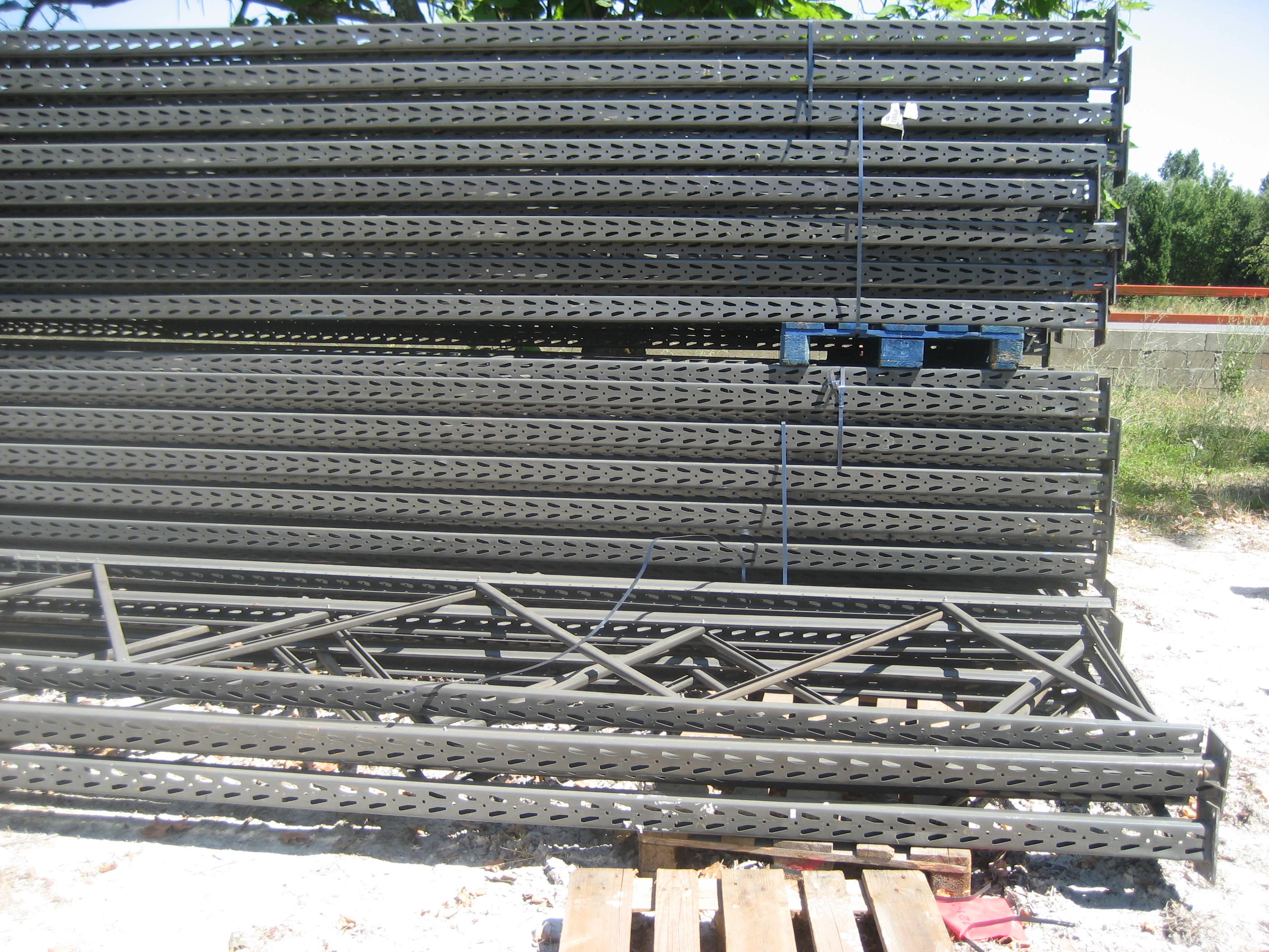 Rack stockage de palettes. Longueur: 3 x 1m20. Profondeur: 1m20. Hauteur 2m40, sur 3 niveaux. Charge: semi-lourd. Merci.