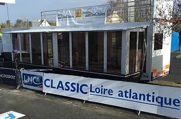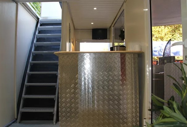 Pour profiter au maximum de l'atmosphère extérieure de votre événement, le camion podium est équipé d'une terrasse extérieure sur le toit.