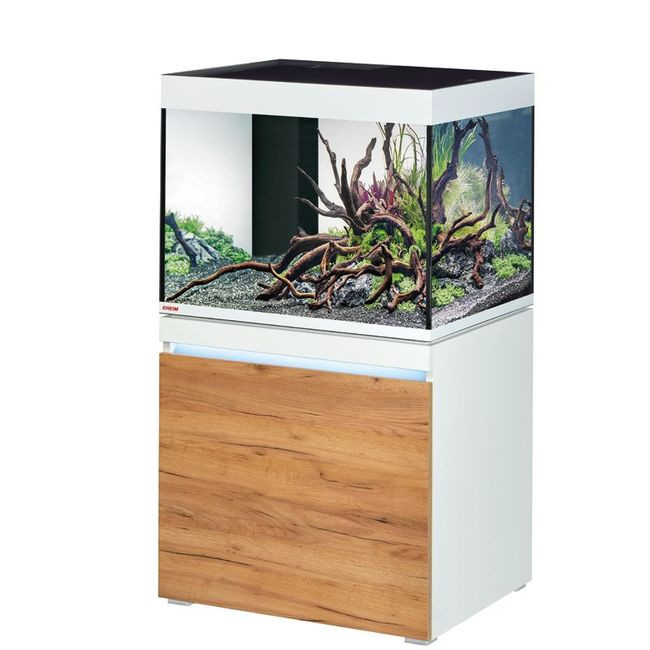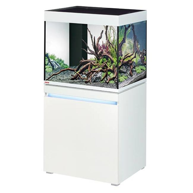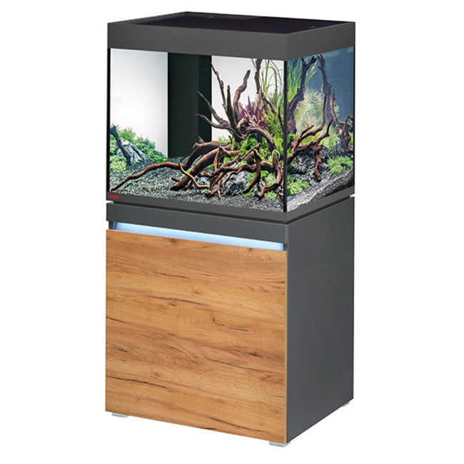 L'aquarium a une capacité de 230 litres, avec un meuble assorti qui offre un design moderne et épuré.