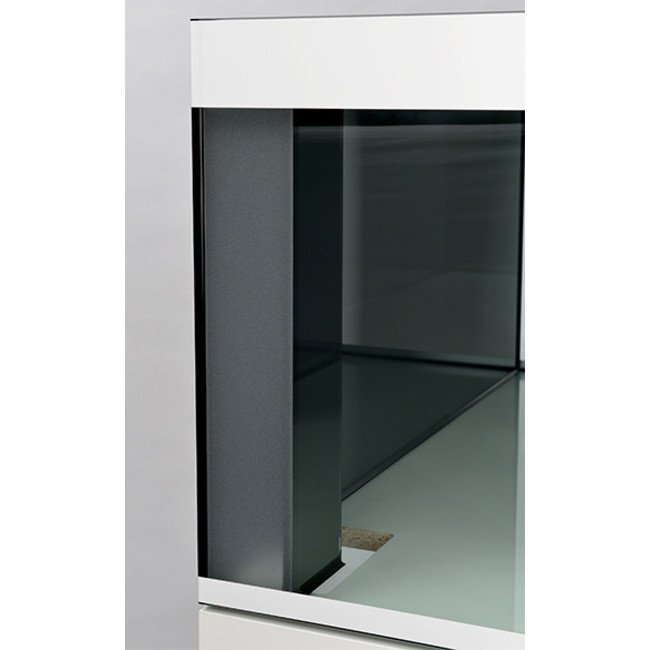 La cuve est en verre flotté sans distorsion, avec des bords polis et des renforts discrets.