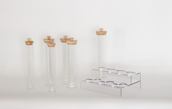 Doté de podiums modulaires et de flacons en verre avec bouchon en bois, ce présentoir a une apparance attrayante et moderne, ce qui améliore l'esthétique générale d'un point de vente.