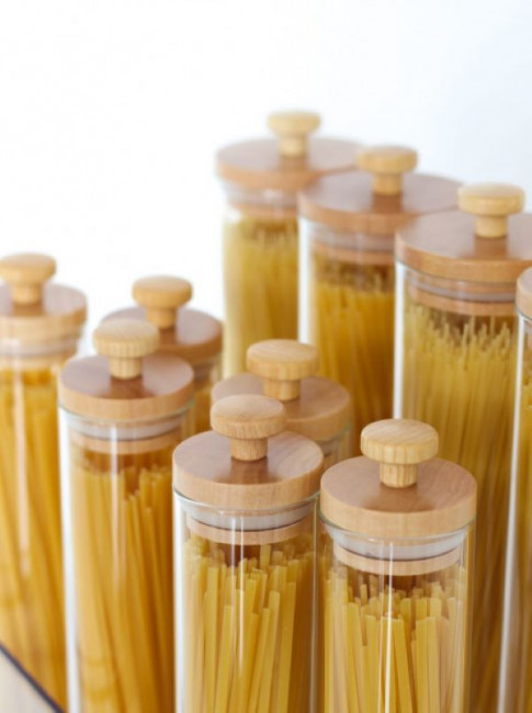 Proposé pour la vente de pâtes longues en vrac comme les spaghettis, linguine ou fettucine, notre présentoir avec tubes en verre est également idéal pour le stockage de gousses de vanille.