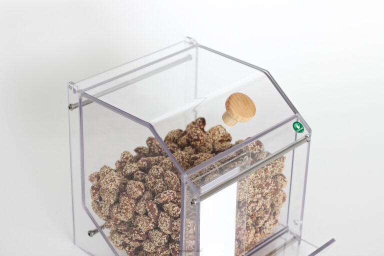 Ce présentoir pour produits en vrac est conçu pour le stockage et la vente de produits alimentaires et/ou de produits d'appels comme des petits jouets ou des goodies.