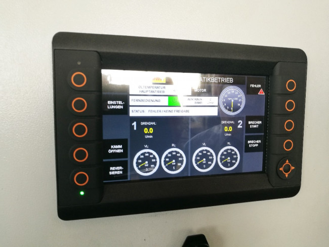 Le châssis de ce broyeur lent birotor est en acier, de construction très robuste entièrement mécanosoudé. Automate programmable de commande et de surveillance du broyeur dernière génération.