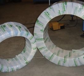 Banderoleuses orbitales pour produits ronds. Cadence100 courrounne de cable/24 heure. Diamtre 900mm à 1520mm. Cerclage sur 4 endroits.