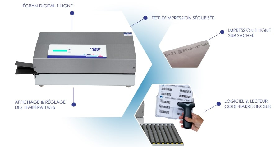 Cette soudeuse offre une prise en main ultra-rapide grâce à son lecteur scanner code-barres et permettant l'impression de vos données personnalisées sur sachets (dates, services, agents, lots...)
