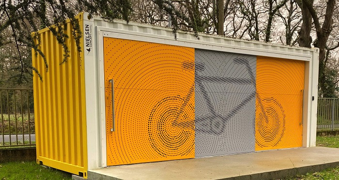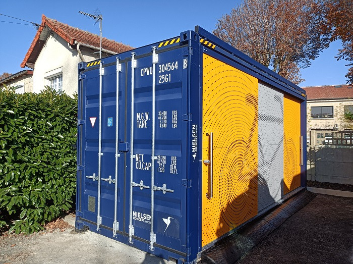 Abri vélo sécurisé à base de conteneur maritime recyclé idéal pour le stationnement de vélos.