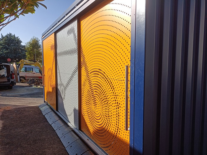 - Abri réalisé à base de conteneur maritime recyclé 3 portes coulissantes en tôle perforée