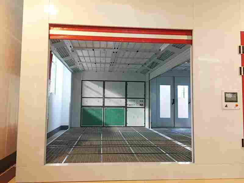 Contrairement à une cabine de peinture classique, l’aire de préparation n’a pas de parois rigides.