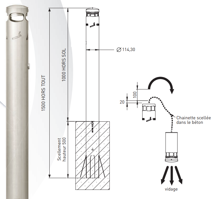 Son format borne, associé à une tête amovible verrouillée par serrure, sécurise la collecte des mégots et simplifie les opérations de vidange.