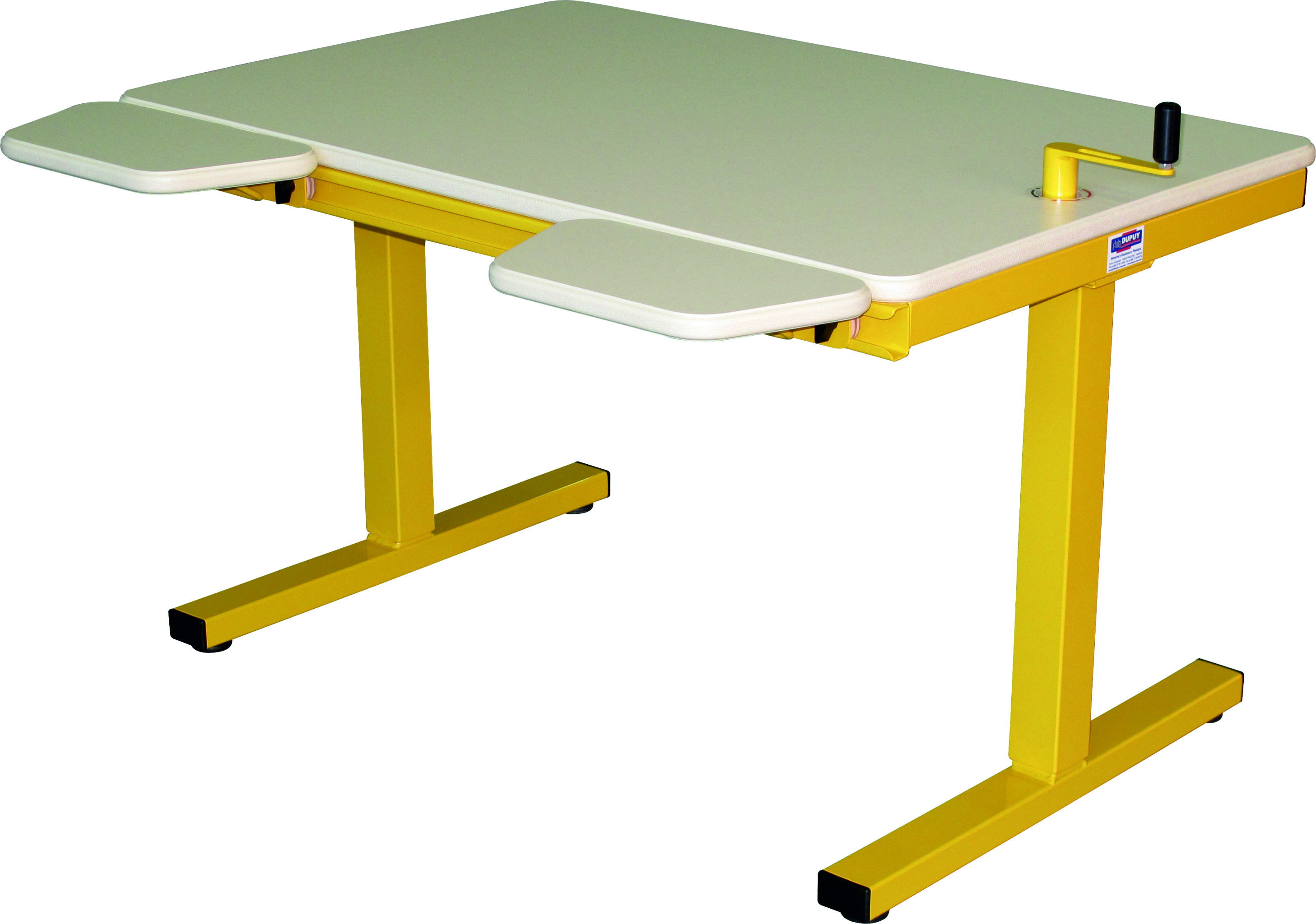 Il est composé d’une structure métallique tubulaire (ne comportant aucune barre entre les pieds) laquée Epoxy et recevant un plateau avec revêtement stratifié et bordure antichoc 900x600 mm épaisseur. 20 mm (dimension entre-pieds 750 mm) hauteur réglable de 550 à 800 mm (du sol au dessus du plateau) par manivelle amovible (dessus et à droite du plateau) avec Glissière sur 900 mm.