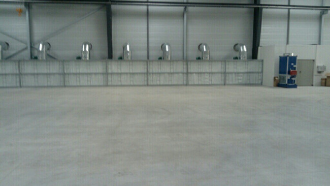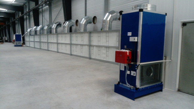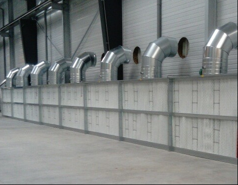 Sur la photo présentée, il s'agit d'un mur filtrant de 27 m qui est constitué de 9 cabines de peinture standard 3x2M avec un débit d'air total extrait de 162 000 m3/h et une filtration exclusive haute efficacité à 99.8 %.