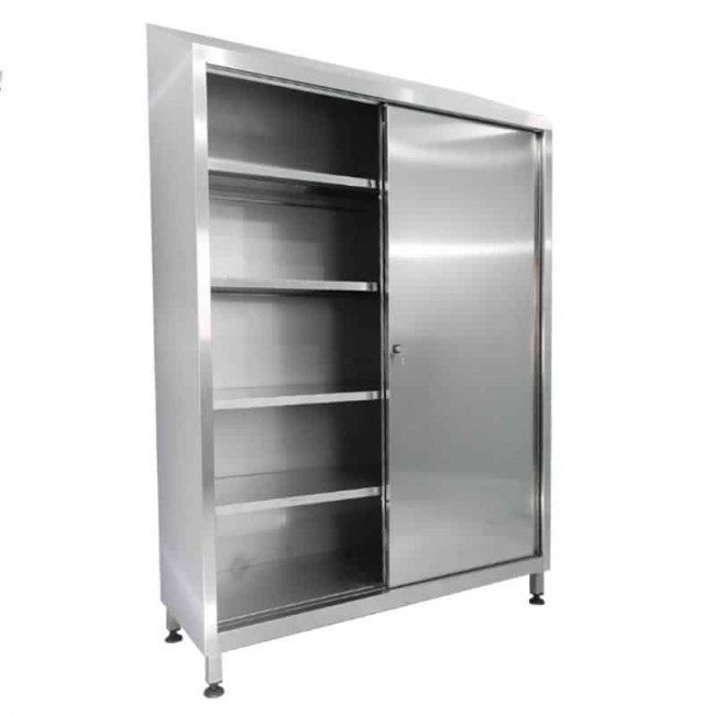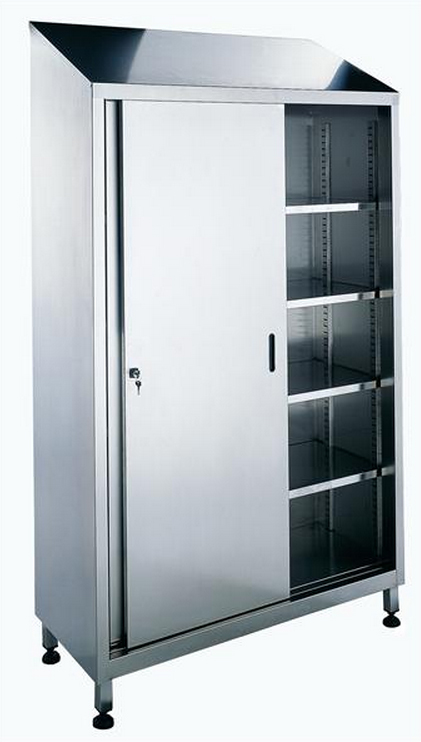 Armoire haute inox deux portes coulissantes dessus penté Construction tout inox Dimensions environ 1000 x 500 x 1800mm. Meuble en acier inoxydable assemblé par soudure. Tout niveau de rangement lisse et sans obstacle. Toit incliné à 10° 3 étagères intermédiaires 12/10ème, avec bords tombés et contre-pli, renforcées par oméga, réglables en hauteur. Plafond, parois latérales et arrière doublés, épaisseur 10/10ème. Deux portes doublées 10/10ème satinées. Portes coulissantes doublées, suspendues sur rail inox avec guidage non apparent en partie basse. Fermeture à clés. 4 roues composite diam.125mm, 2 pivotantes avec freins à bandage en caoutchouc non tachant et vis inox 10x90 [Chape en acier inox, axe boulonné, moyeu à billes, charge maximum 150 kg/u, conditions d"utilisations de -20°C à +80°C]. Pour le repère UC104 fourniture d"un bac de rétention PEHD amovible adapté aux dimensions de l"armoire.