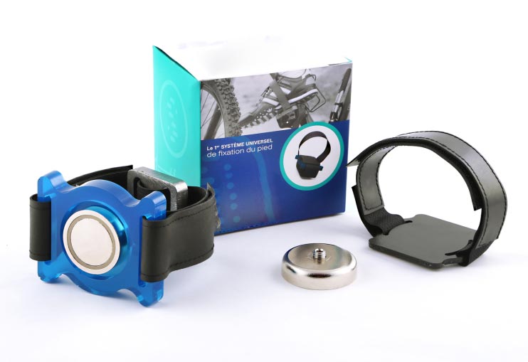 Un équipement qui aide les handicapés qui trouvent du mal à pédaler sur un vélo via un module aimanté se fixe à l'aide d'une sangle Velcro sur la pédale.