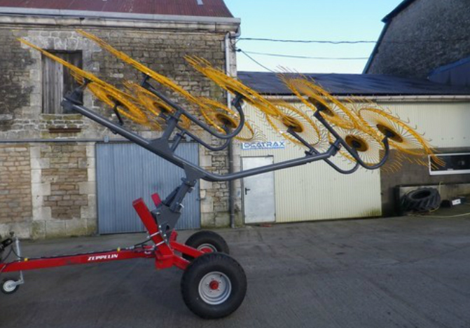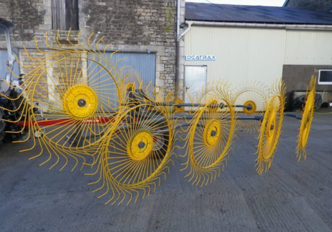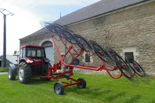Nous vous proposons un andaineur pour tracteur, ceci est une machine agricole composée de râteaux qui tournent autour d'un axe fixe qui permettent de mettre le foin ou la paille en ligne continue ce qui facilite la récolte.