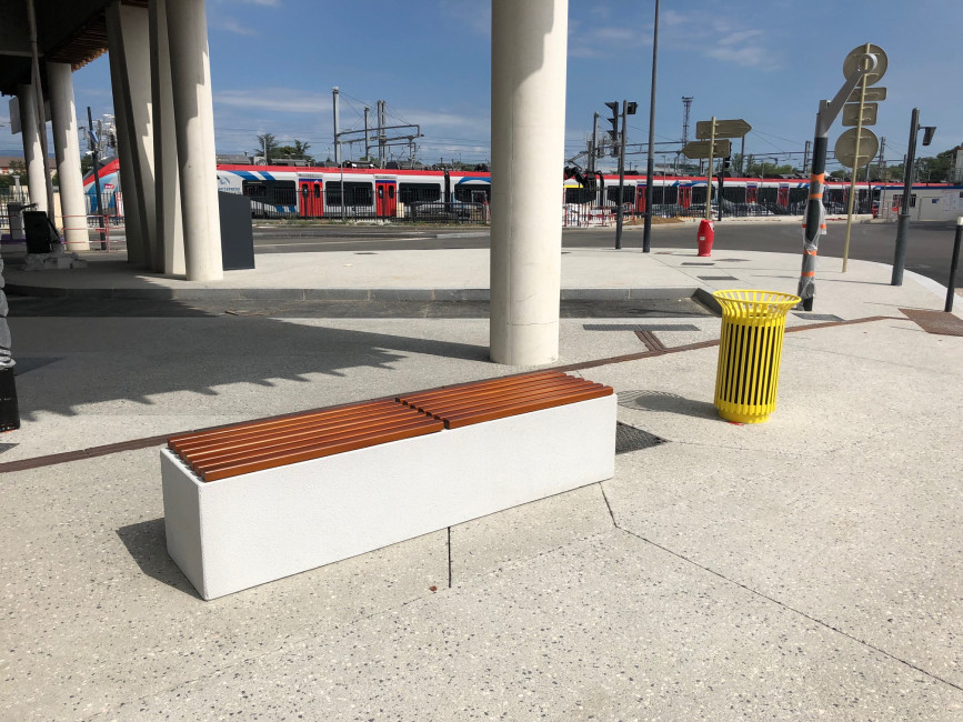 • 19 ml d’assises bois en lames de robinier larg 40cm