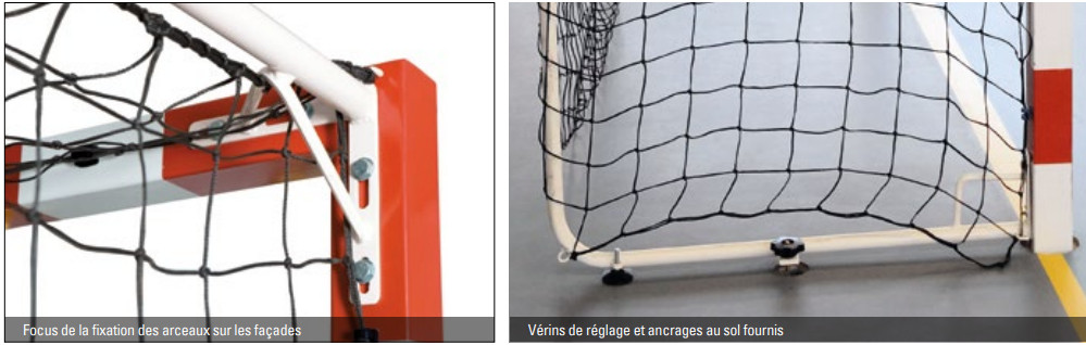 Chaque but est équipé d’une barre de stabilisation Ø 32 mm à fixer au sol, améliorant la tenue sur toutes les surfaces de jeu.