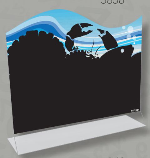 Vendue par paquet de 3 Surface ardoisée imprimée sur Plixi 2 mm Dimensions : 30 x 18 cm Encombrement de la base 30 x 7 cm Pied plié à chaud Ecriture au feutre craie