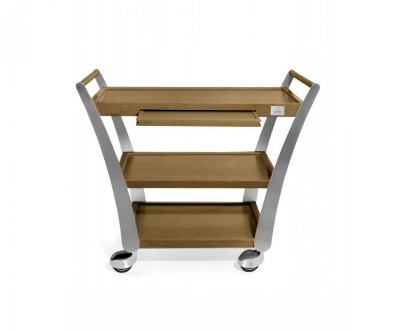 Ce guéridon de service professionnel combine l'élégance du placage chêne massif avec la robustesse de l'inox brossé pour offrir une solution de transport optimale dans votre établissement.