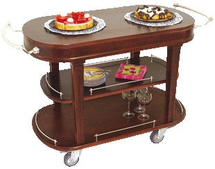 Cette table de service en bois est un mobilier de restauration conçu pour transporter les repas et servir les clients.