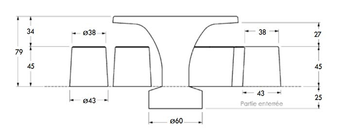 La table est conçue pour être scellée ou fixée, avec une réservation de 25 cm dans le sol.