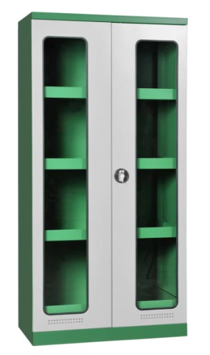 - Structure acier robuste 9/10, peinture poudre époxy corps vert RAL 6032 porte vitrées grises RAL 7035.
