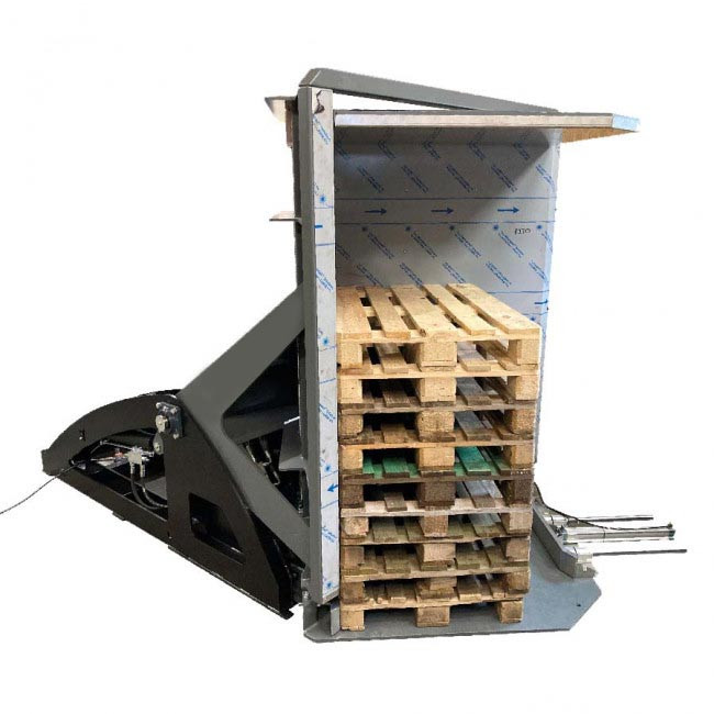 La machine bascule de 115° vers l'arrière avec le produit, la palette est ensuite récupérée par la machine et apportée au sol. L'opérateur n'a plus qu'a changer la palette avant que le retourneur de palette de ne reprenne pour la positionner sous les produits.