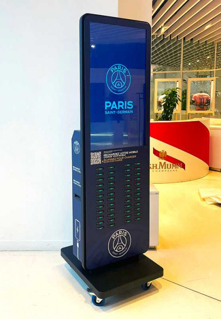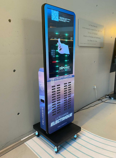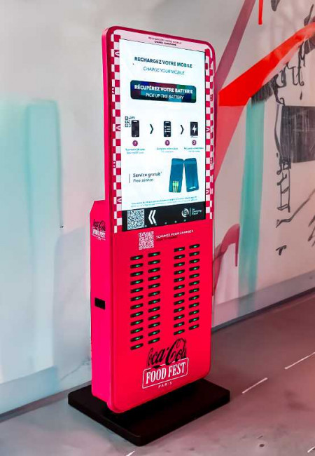 Un QR code permet de mettre en charge les téléphones, une fois scanné, une batterie se débloque et permet à l’utilisateurs de la récupérer.