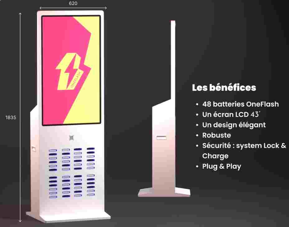 Véritable station de recharge mobile grande capacité, elle permet de maintenir une disponibilité élevée de batteries grâce à un parc de 48 batteries 5000 mAh dédiées à un usage intensif en libre-service.
