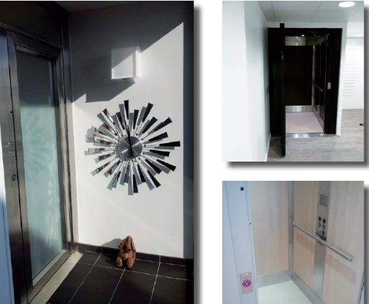 - Les ascenseurs basse vitesse s’installent sans mur porteur, dans une simple gaine en placo. Et ce, sans local machine, sans fosse (avec une rampe) ou avec une fosse de 8 cm en extérieur ou en intérieur dans les bâtiments existants.