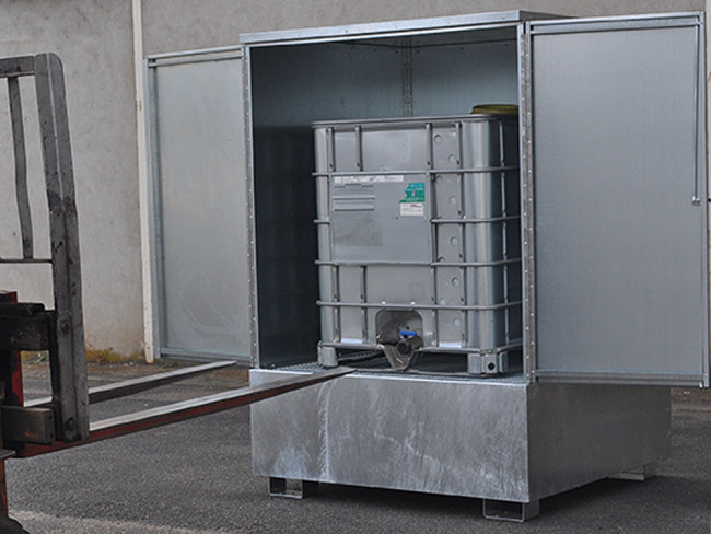 Cet abri de stockage grande hauteur avec rétention est en acier galvanisé. Il s'utilise pour sécuriser le stockage de liquides polluants contenus dans un IBC, cuve 1000 litres, cubitainer ou GRV.