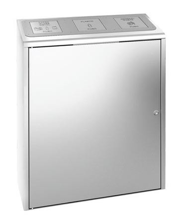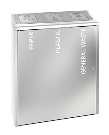 Cette borne est équipée de trois trappes distinctes avec signalétique claire pour différents types de déchets.