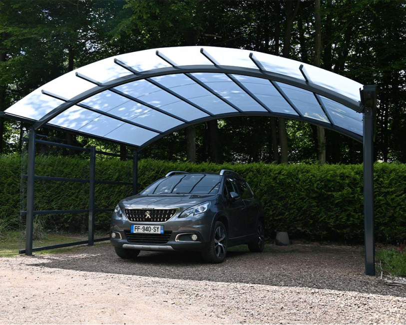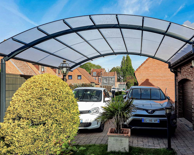 Associé au polycarbonate massif, il constitue un abri résistant aux intempéries capable de protéger durablement un véhicule grand gabarit.