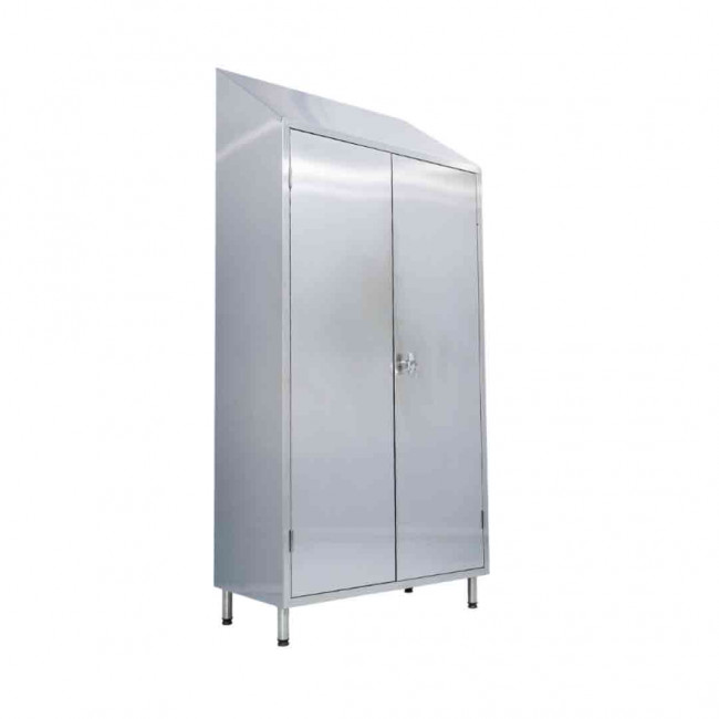 armoire à balai en acier inoxydable est équipée de portes battantes avec serrure à clé et poignée.
