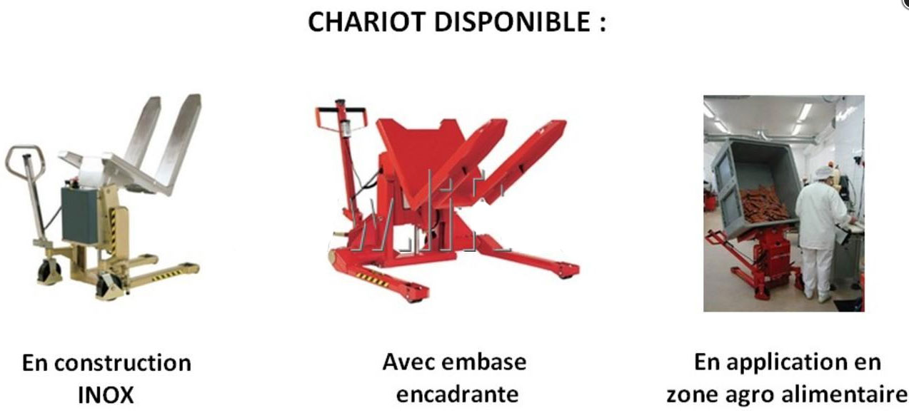 L’embase du chariot peut être standard, mais également encadrant pour palettes fermées.